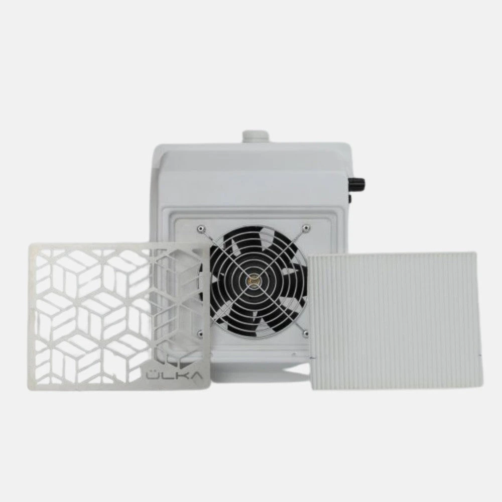 Aspirador cómodo y potente que mantendrá limpio el lugar de trabajo del técnico de uñas. El aspirador se compone de: un cuerpo con 1 extractor incorporado, en el lado del cuerpo hay un control de encendido y un botón (encendido / apagado), un conector para la fuente de alimentación y un lugar para un filtro.