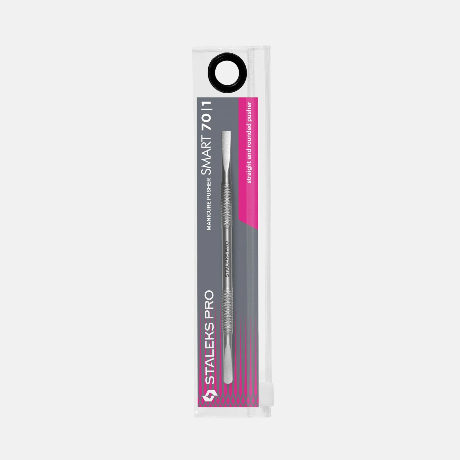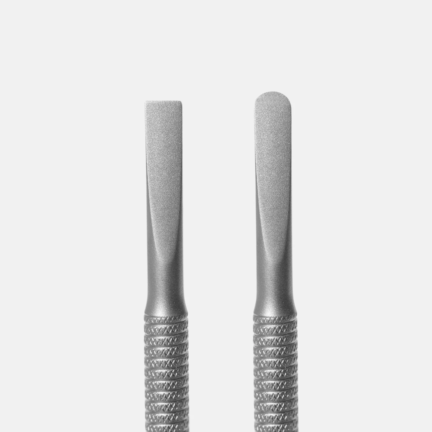 Empujador de acero inoxidable doble para cutícula, uno de los extremos es redondeado que ayuda a levantar y empujar la cutícula y el otro tiene forma recta para cutículas muy crecidas. Contiene un mango antideslizante para ayudar a un mejor agarre y facilitar el trabajo.