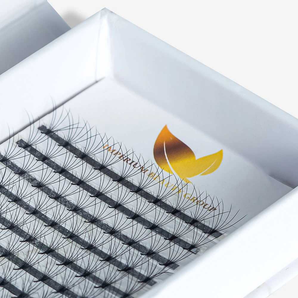 Extensiones de Pestañas Volumen Ruso Pre-hechas de 6 extensiones (6D). Contiene 160 abanicos, cada uno formado por 6 extensiones. La caja contiene filas de largos variados de 9, 11, 13 y 15 mm.