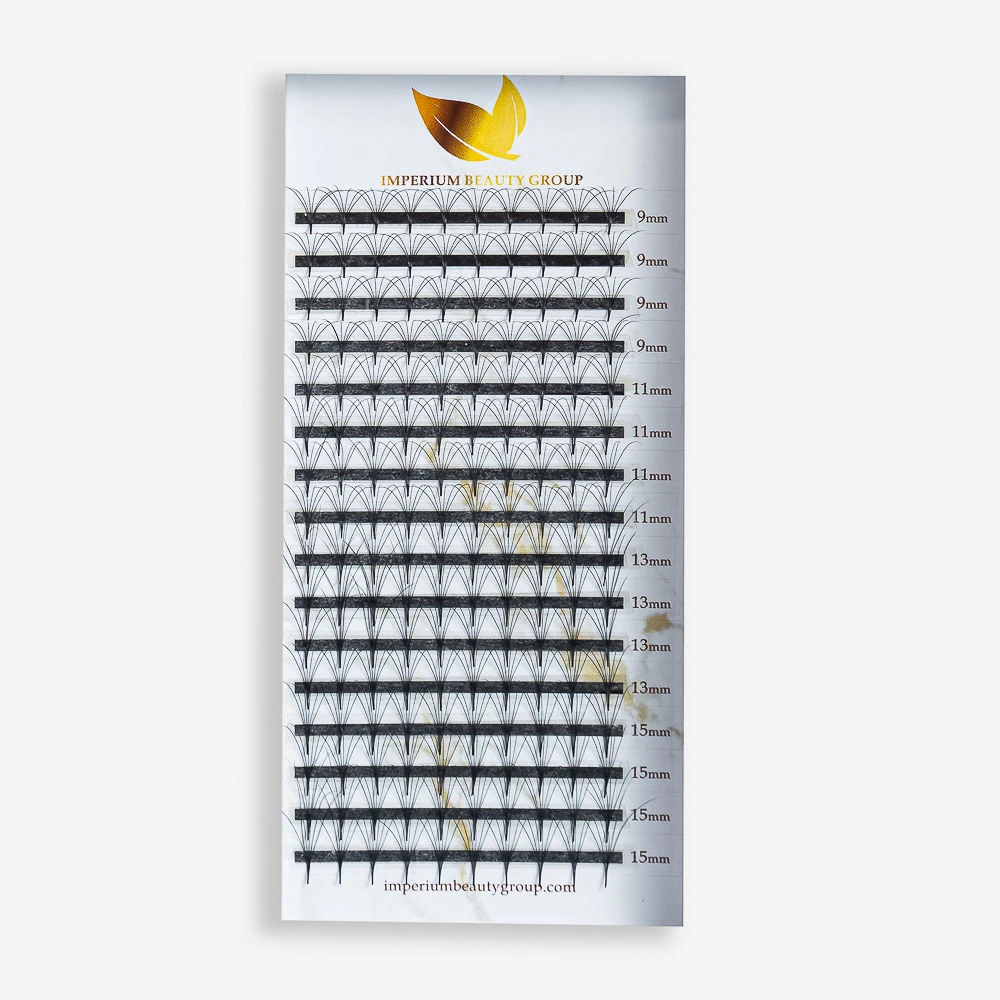 Extensiones de Pestañas Volumen Ruso Pre-hechas de 6 extensiones (6D). Contiene 160 abanicos. La caja contiene filas de un único largo.