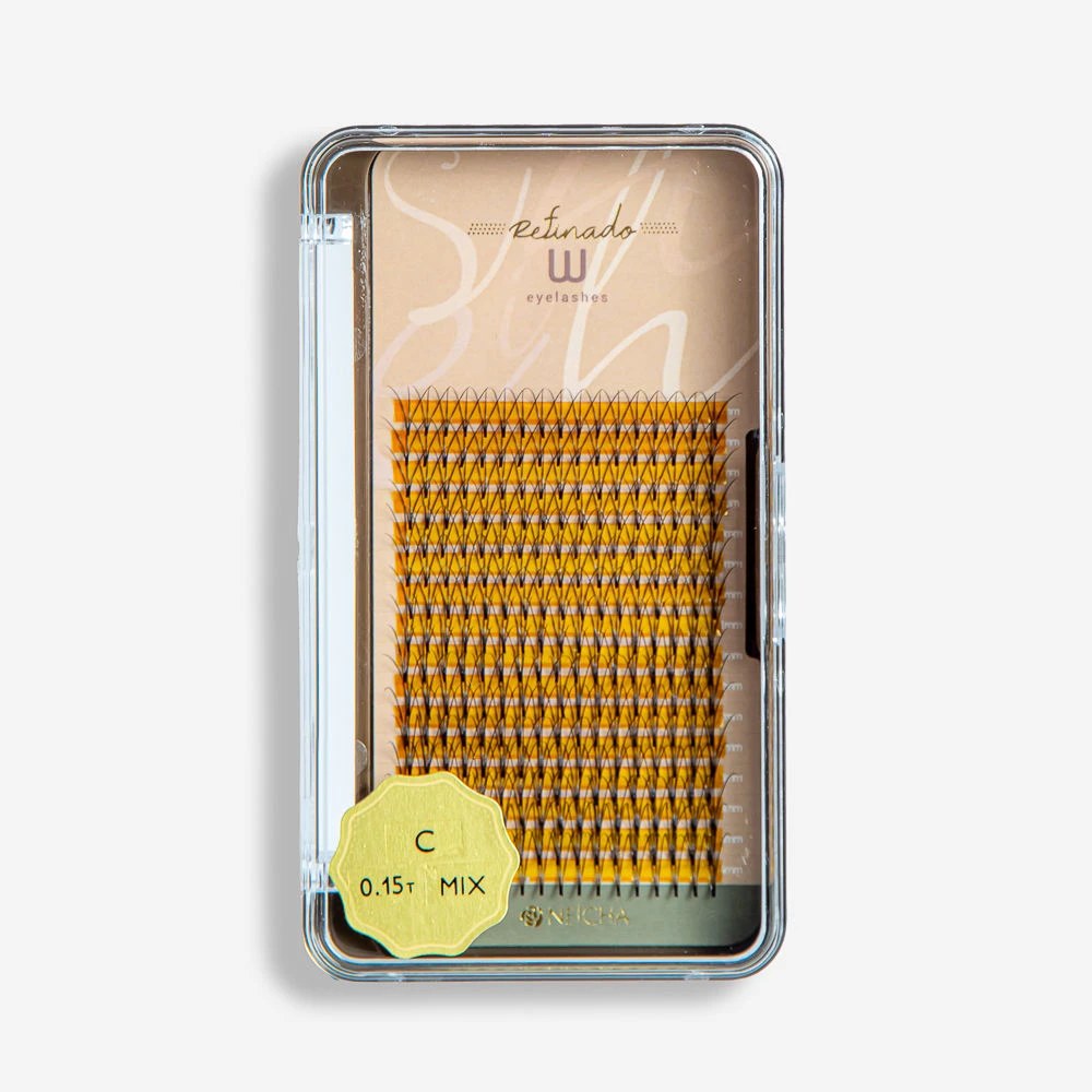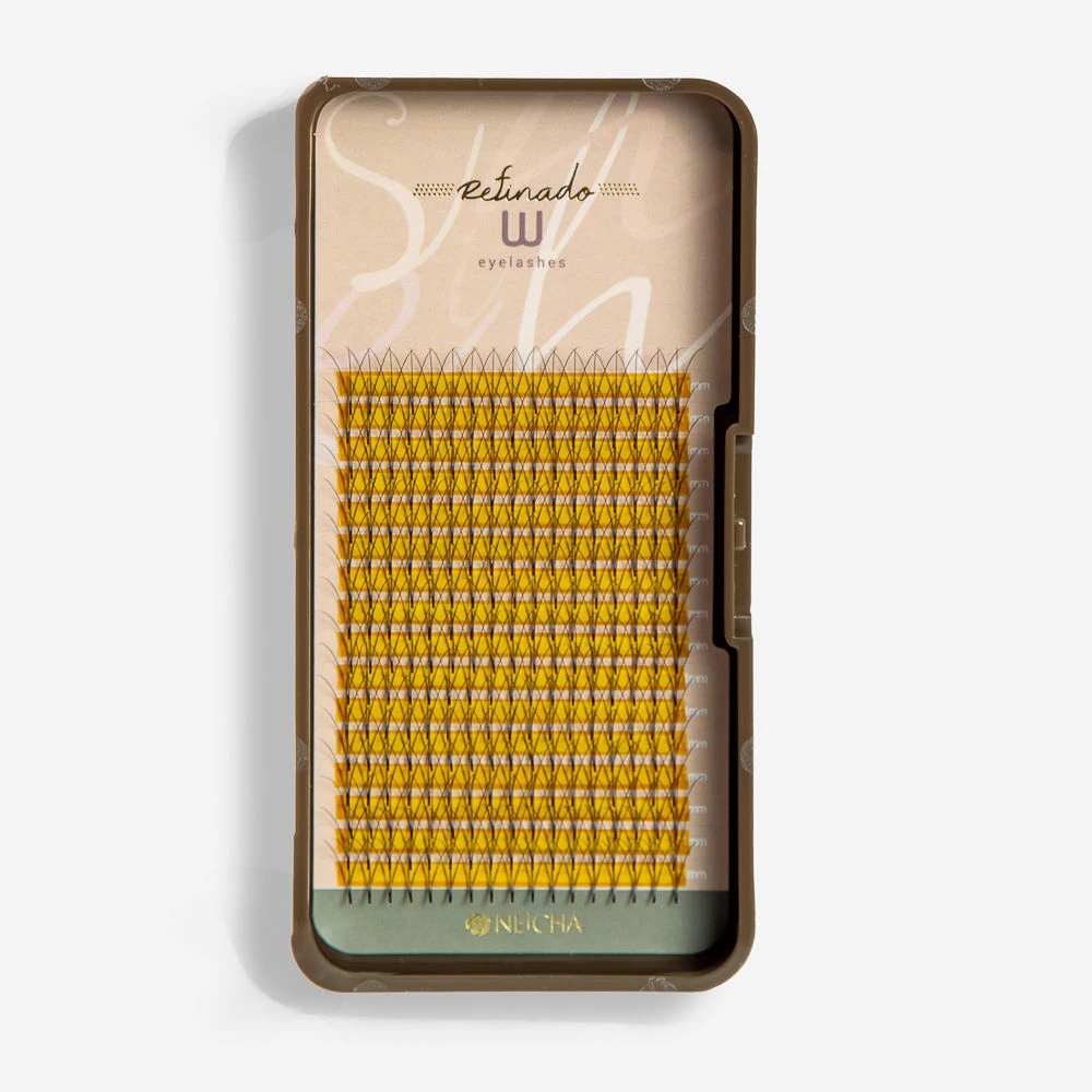 Caja con 16 filas de extensiones de pestañas de seda en forma de W, formadas por tres pestañas, permite una rápida aplicación y más volumen.