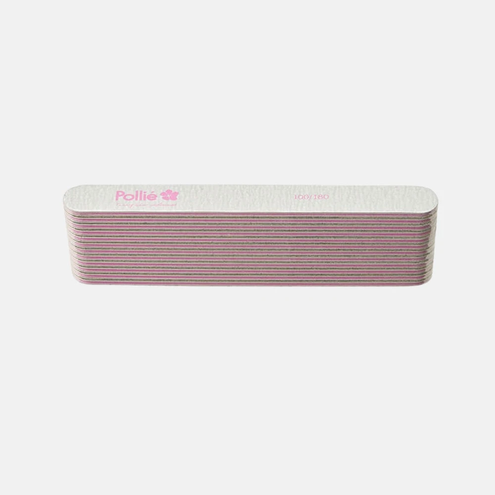 Lima tipo cebra para uñas artificiales. Consigue darle la forma y el largo deseado a las uñas con esta lima de dos caras diferentes. Una cara tiene grosor de grano 100 y la otra tiene un grosor de grano 180.