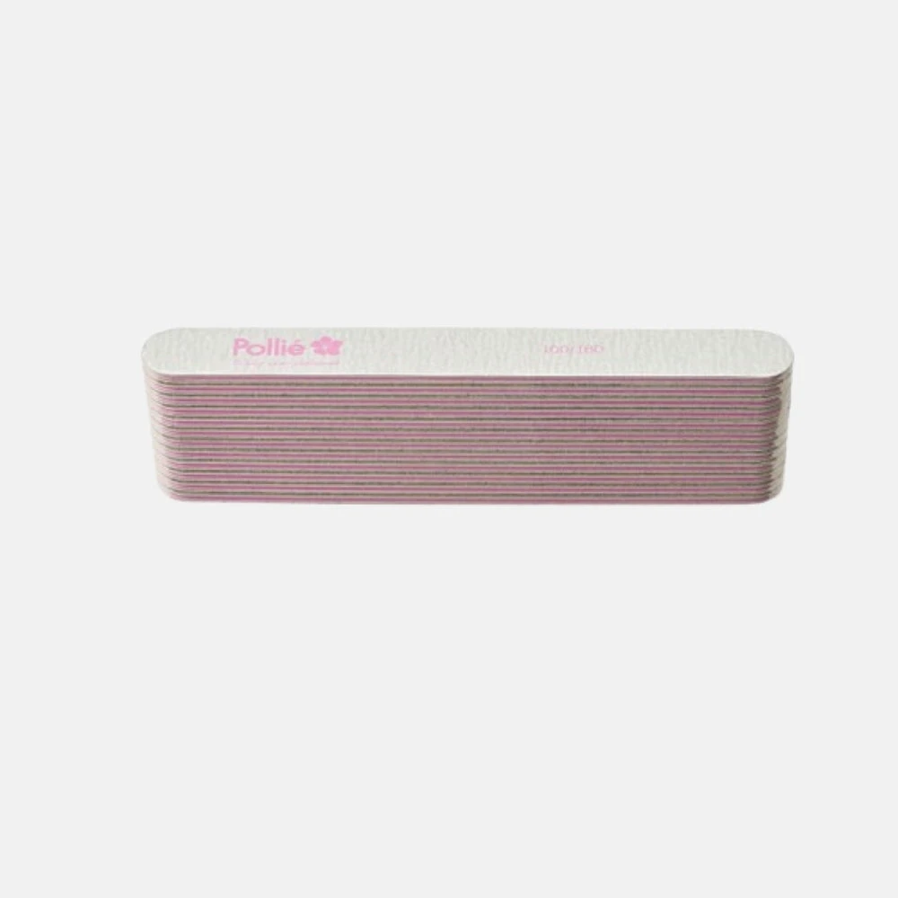 Lima para acrilico de uñas. Una cara tiene grosor de grano 100 y la otra tiene un grosor de grano 180.