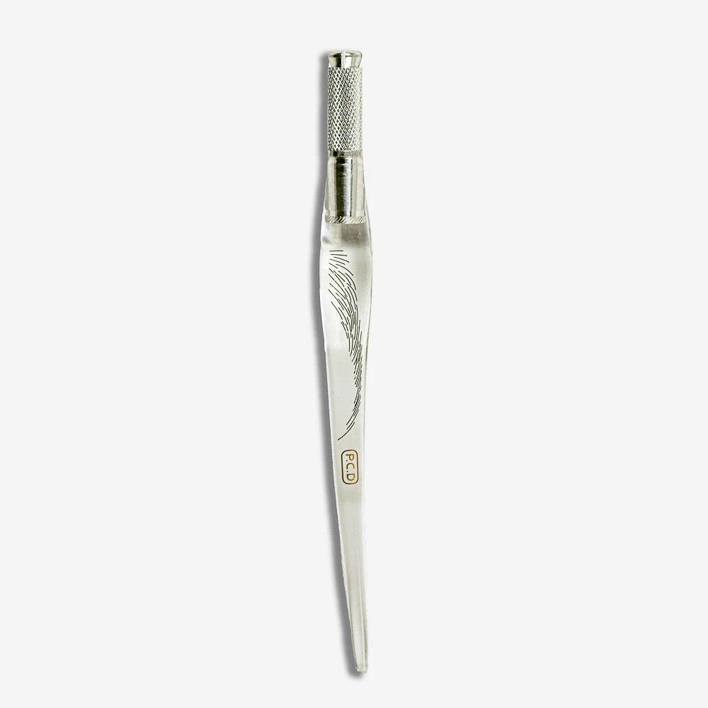 Pluma para microblading fabricada en acero y metacrilato. Es desmontable lo que permite su desinfección en autoclave o rayos UV.